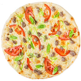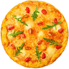 White base pizza, mozzarella, provolone, pecorino, gorgonzola, cherry tomato, basil and parmesan.